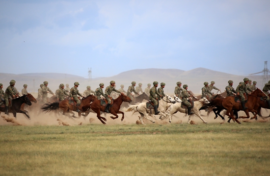 7月14日,陆军军马力量基层建设规范化集训在某边防旅举行。图为军马分队进行“集团冲锋”课目演示。张永进/摄