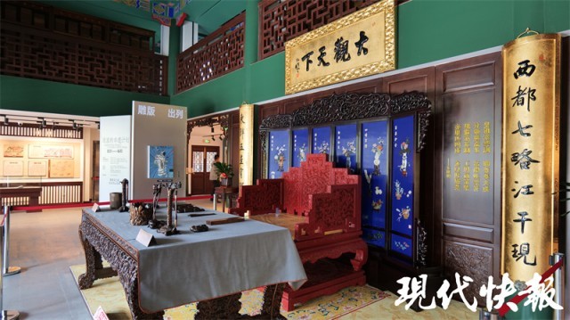 馆内鸳鸯厅为“何以状元”主题展厅,通过实物展品再现古代科举流程,介绍了一个状元是如何诞生的。现代快报记者了解到,2001年,在整修鸳鸯厅时,曾在上方发现一方被后人所加“吊顶”遮住的匾。潘世恩高中状元后,为官五十余年,历经四朝,深得皇帝恩宠,被誉为“三百年间第一福气之人”。每逢大寿,皇帝都会亲赐御匾。后经专家考证,该匾即是道光皇帝于潘世恩六十大寿之时御笔赏赐的黑底盘龙金书方匾。