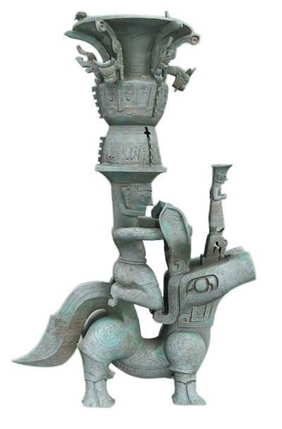 拼接修复后的铜兽驮跪坐人顶尊铜像。