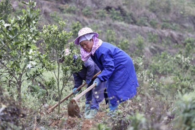 贵州省晴隆县鸡场镇学官社区农民在脐橙园进行管护打理(2023年3月29日摄)。新华社记者 崔晓强 摄