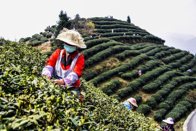贵州省晴隆县三合村村民在采摘春茶(资料照片)。新华社发(陈亚林 摄)