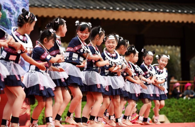 孩子们在贵州省晴隆县阿妹戚托小镇参加文艺演出(2019年6月6日摄)。新华社记者 杨文斌 摄