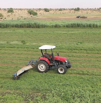在中国援毛里塔尼亚畜牧业技术示范中心,工作人员操作机械收割紫花苜蓿。张美欧摄