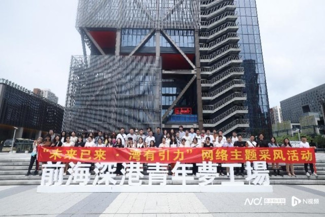 “未来已来·湾有引力”网络主题采风团在前海梦工场前合影。
