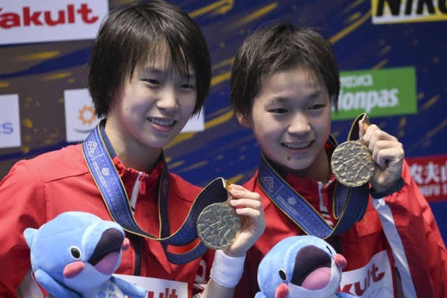 ↑7月16日,冠军中国组合陈芋汐(左)/全红婵在2023年福冈世界游泳锦标赛跳水女子双人10米台颁奖仪式上。新华社记者 许畅 摄