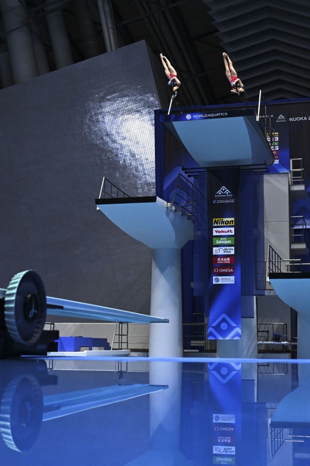 ↑7月16日,陈芋汐(左)/全红婵在2023年福冈世界游泳锦标赛跳水女子双人10米台决赛中,最终他们以369.84分的总成绩夺得冠军。新华社记者 许畅 摄