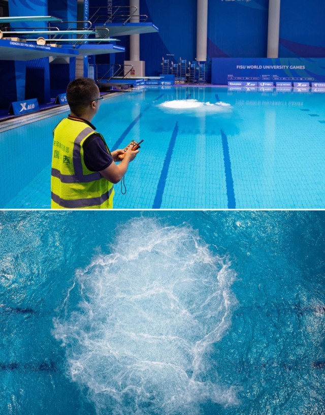 ↑这是一张拼版照片。上图为:7月22日,在简阳文体中心游泳馆,中国华西四川机司东来印象(简阳文体中心)项目工作人员正在操作池底安全气垫系统。下图为:池底安全气垫系统效果展示。该系统为确保跳水运动员安全,在气体释放时形成上升水流和侧向水流增加水体的柔软度和弹性,减缓人体在水中的降落速度,防止对运动员身体的伤害。新华社记者 江宏景 摄
