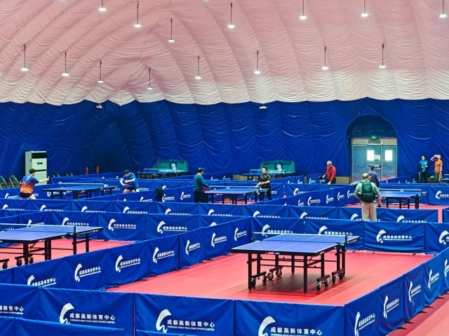 ↑3月1日,人们在成都高新体育中心多功能馆的临时训练气膜馆练习打乒乓球。该临时训练气膜馆采用轻型装配式气膜结构,利用气压来支撑,无需任何梁、柱,可得到更大的完全净空的建筑空间,具有节约能源、减少水资源消耗、降低二氧化碳排放量、延长使用寿命、降低建筑物运行成本、促进可持续发展等优点。 新华社发(陈坤 摄)
