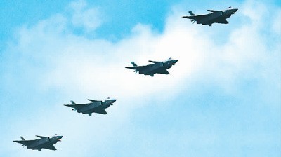 歼—20四机编队进行机动飞行展示。周 玮摄(人民视觉)
