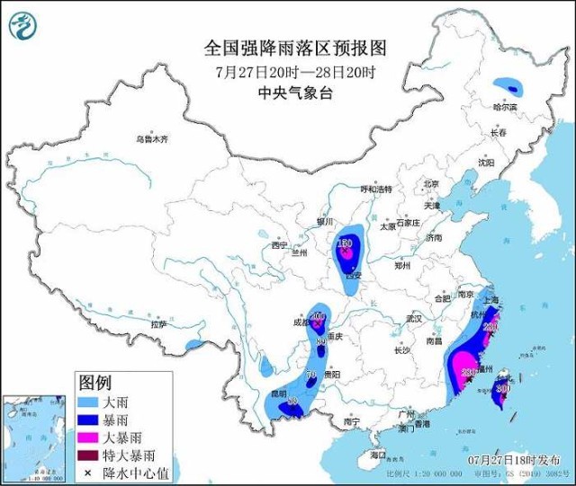预计,7月27日20时至28日20时,浙江东部和南部、福建、台湾岛大部以及云南东南部、贵州西部、重庆西部、四川东部、陕西中部和甘肃东部等地部分地区有暴雨或大暴雨,其中,福建东南部、浙江东南部、台湾岛东南部等局地有特大暴雨(250~300毫米);上述部分地区伴有短时强降水(最大小时降雨量30~60毫米,局地可超过80毫米),局地有雷暴大风等强对流天气。