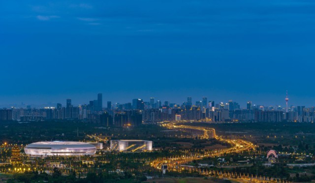 从龙泉山俯瞰夜幕下的东安湖体育公园(7月23日摄),成都大运会开幕式将于28日晚在此举行。新华社发(廖铁军摄)