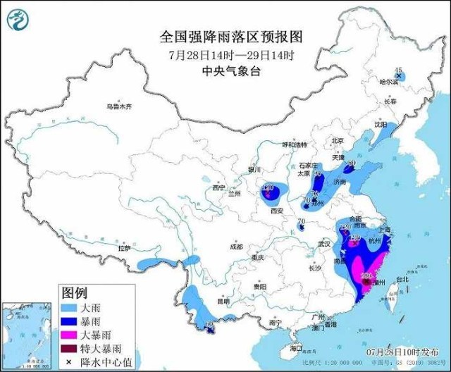中央气象台7月28日06时继续发布台风红色预警,10时继续发布暴雨橙色预警。