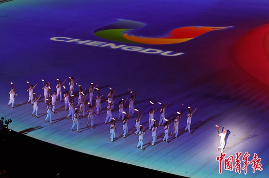 7月28日,四川省成都市,成都第31届世界大学生夏季运动会开幕式上,31名火炬手奔跑向火炬台,准备共同点燃成都大运会主火炬。中青报·中青网记者 赵迪/摄