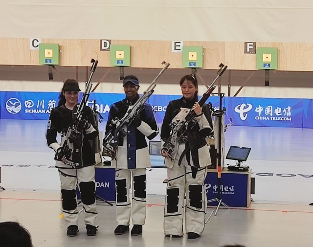 中国青年报客户端成都7月29日电(中青报·中青网记者杨屾文并摄)在刚刚结束的成都大运会女子10米气步枪决赛中,来自江汉大学的中国选手邢航以229.3环的成绩获得第三名。预赛中,邢航就表现出色,6组射击总成绩为630.3环,排名第二位。决赛中,邢航在基础10发射击中表现一般,但她及时调整,在之后的双发淘汰中越战越勇,特别是在第四轮双发淘汰中,命中10.9环的满环,震惊全场。最终,她为中国队赢得了一枚铜牌。冠亚军分别被印度和美国选手获得。