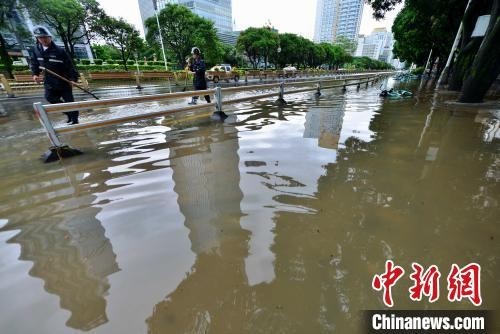 7月29日,受台风影响,福建福州城区一处路段积水严重。今年第5号台风“杜苏芮”28日以强台风级登陆福建后,给福州带来强降雨。 中新社记者 张斌 摄