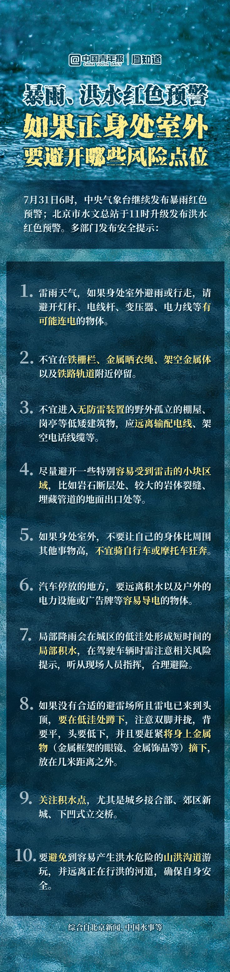 7月31日6时,中央气象台继续发布暴雨红色预警。北京市水文总站于当日11时升级发布洪水红色预警。如果遇到暴雨、洪水时恰好身处室外,应避开哪些风险点位?学习科普知识,安全度汛。
