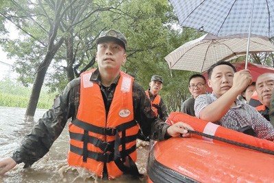 7月31日,武警北京总队某部官兵在北京市房山区大石河琉璃河镇区域转移群众。