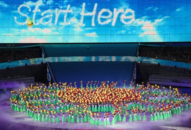 2001年8月22日,第21届世界大学生运动会开幕式上的大型文艺表演《你好 21》。新华社记者王呈选摄