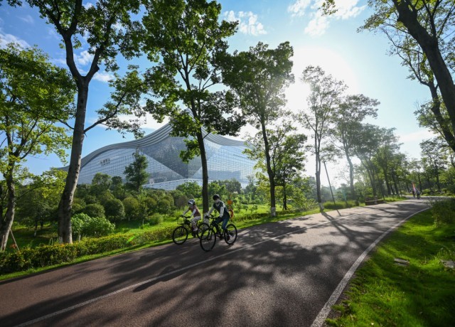 7月16日,人们在成都高新区桂溪生态公园骑行。新华社记者王曦摄