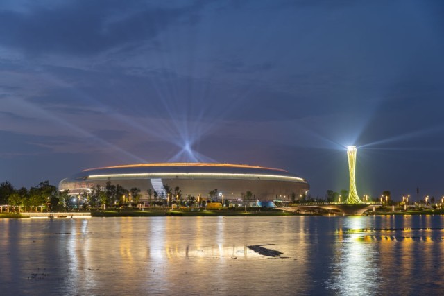 7月18日,在成都市龙泉驿区拍摄的夜幕下的东安湖体育公园。新华社记者黄伟摄