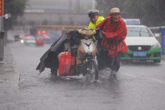 7月30日,河北廊坊,市区解放桥下一辆电动三轮车在大雨中发生故障,交警一大队执勤交警帮助驾驶员将电动三轮车推到安全地段,确保市民出行安全。视觉中国供图
