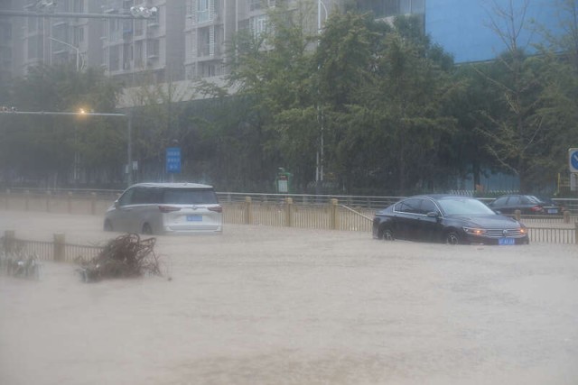 7月31日,北京门头沟,道路上的车辆被淹。 视觉中国供图