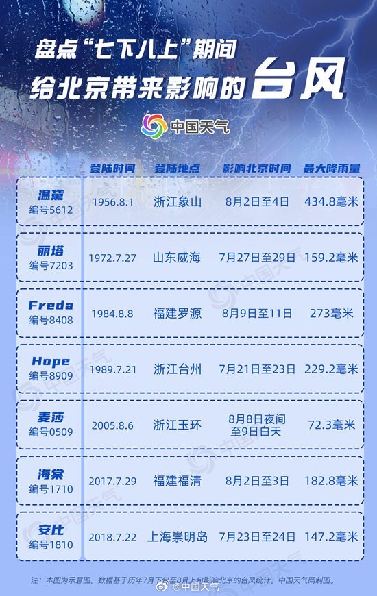 本次极端降水过程中,台风“杜苏芮”的残余环流北上是其中一个重要的原因。历史上北京也曾多次受到台风及其减弱后的低压影响,出现较强降雨。例如2017年第10号台风“海棠”和2018年第10号台风“安比”给北京带来的最大降雨量都超过了100毫米,更早的1956年第12号台风“温黛”导致的最大降雨量更是超过400毫米。