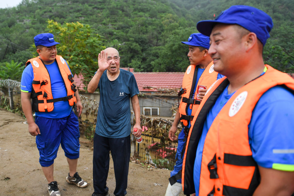 8月1日,在北京市门头沟区水峪嘴村,一名87岁的村民向助他脱困的河北秦皇岛猎豹救援队队员表示感谢。新华社记者 鞠焕宗 摄