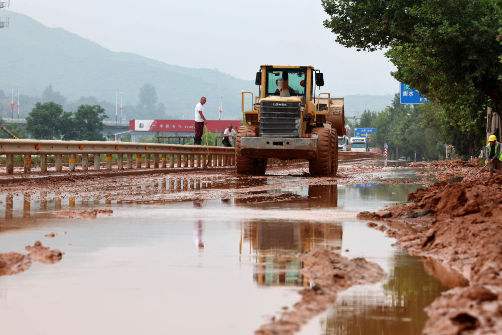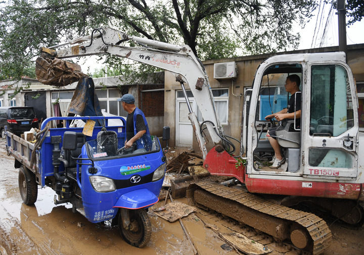 7月31日,在河北省石家庄市井陉县307国道长岗村段,防汛工作人员驾驶机械清理淤泥。新华社发(梁子栋摄)