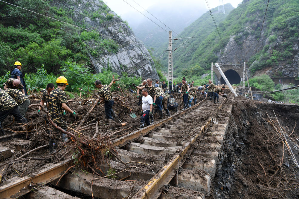 8月1日,在北京市门头沟区水峪嘴村附近一段被阻断的铁路线上,中铁六局的工作人员在清理轨道上的杂物,全力恢复交通。新华社记者 鞠焕宗 摄