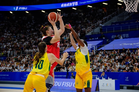8月1日,成都大运会女篮1/4决赛中,中国队23号球员刘禹彤突破上篮。该场比赛中国队以84∶64大胜巴西女篮,成功晋级半决赛。汪龙华/摄