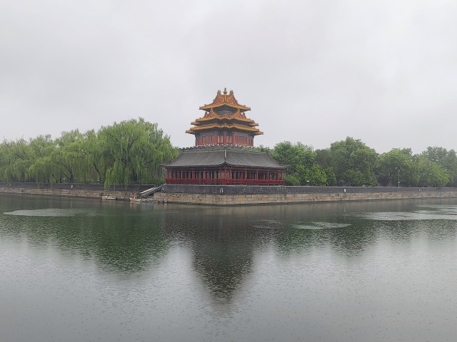 △2023年8月1日,北京持续降雨,雨中的故宫角楼和护城河。