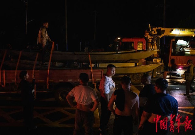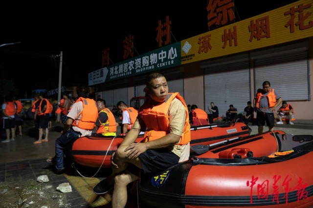 8月2日深夜,河北涿州,涿州市靖雅中学附近,37岁的佟村村民句晓山在等待各方力量开展救援。昨晚白沟河决堤后,水还没到他家,他就连夜将一家人送到北京住进宾馆避险,自己回到村里成为救灾志愿者。
