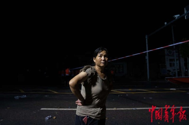 8月2日晚,河北涿州,涿州市靖雅中学安置点附近,52岁的屈文娥在警戒线外等待消防官兵将自己的家人从安置点内救出。