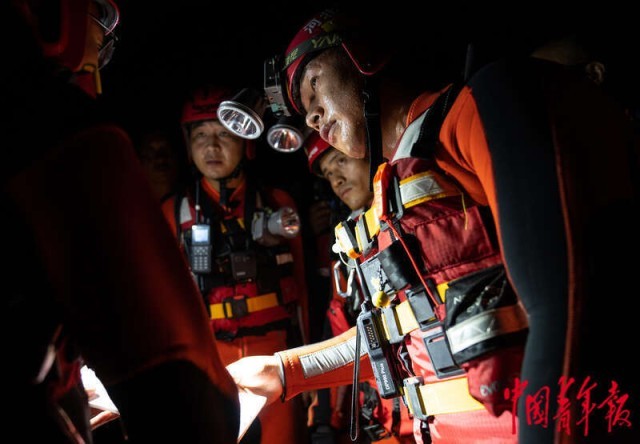 8月2日深夜,河北涿州,涿州市靖雅中学附近,消防官兵勘探现场情况后分析救援方案。