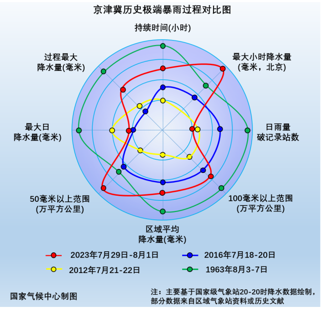 持续时间长。本次过程从7月29日开始,至8月1日结束,接近4天时间,北京降雨持续时间达83小时;河北邯郸、邢台、石家庄,山西晋中,河南鹤壁及北京西南部等地连续两天出现大暴雨到特大暴雨。