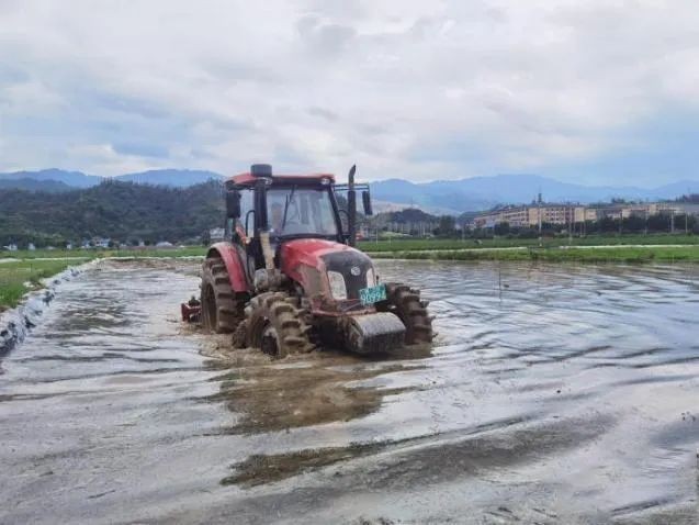 ▲贵州省榕江县车江二村足球队队员邰文勇驾驶农机翻耕水田。(中新网发 周燕玲 摄)
