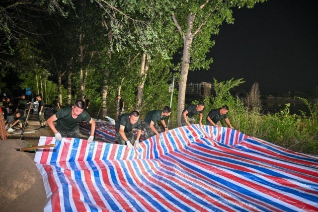 ↑8月4日,武警天津总队官兵在大清河天津静海段南堤上进行岸堤加固作业。