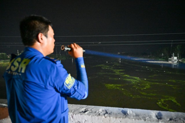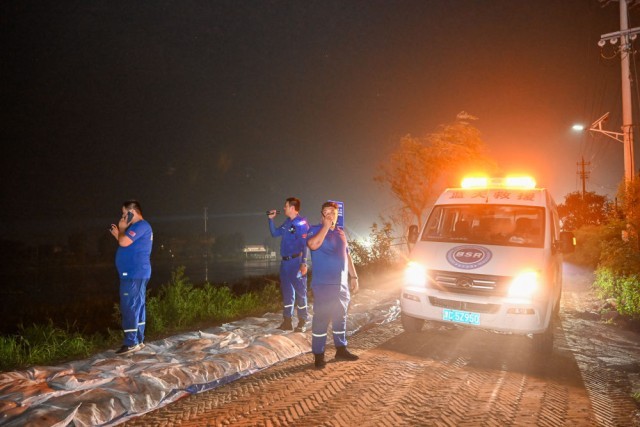 ↑8月4日,在大清河天津静海段北堤,天津静海蓝天救援队队员夜间巡堤时发现隐患点后,通过灯光指引南堤队员现场查看。