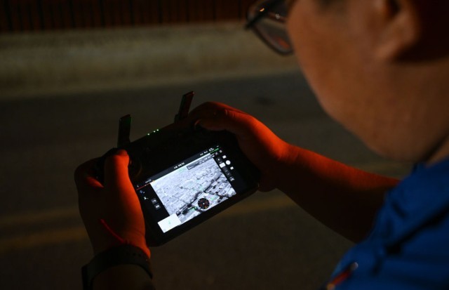 ↑8月4日,天津静海蓝天救援队队员使用热成像无人机确认村内是否还有居民未撤离。