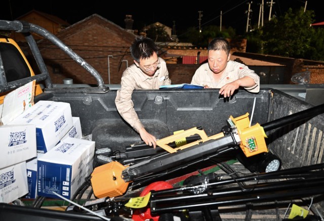 ↑8月4日,国网天津电力工程抢险人员在天津市静海区台头镇现场核对应急照明灯具准备情况。