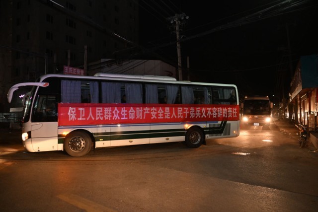 ↑8月4日,在天津市静海区台头镇,武警天津总队官兵夜间乘车进行转场。