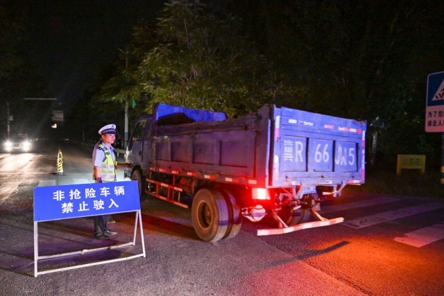 ↑8月4日,天津市公安局静海分局执勤交警在台头镇入镇卡口处指挥抢险车辆进入。