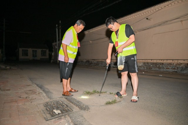 ↑8月4日,在天津市静海区台头镇南二堡村,村党支部书记、村委会主任韩建祥(右)带领村干部在村内检查雨水井盖是否松动。