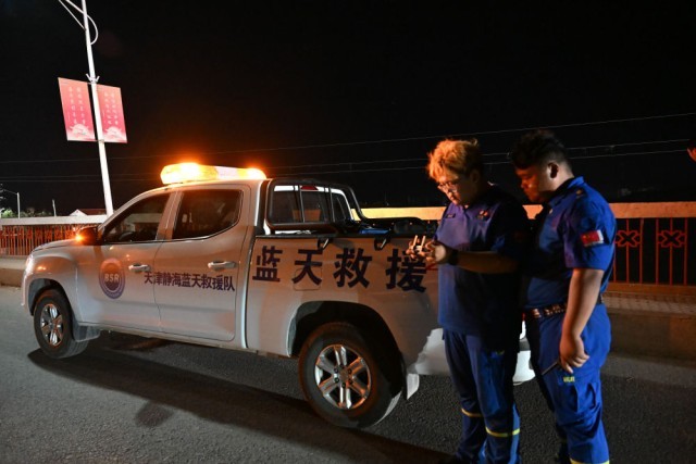 ↑8月4日,天津静海蓝天救援队队员在天津市静海区台头镇革命桥上观测桥下洪水情况。