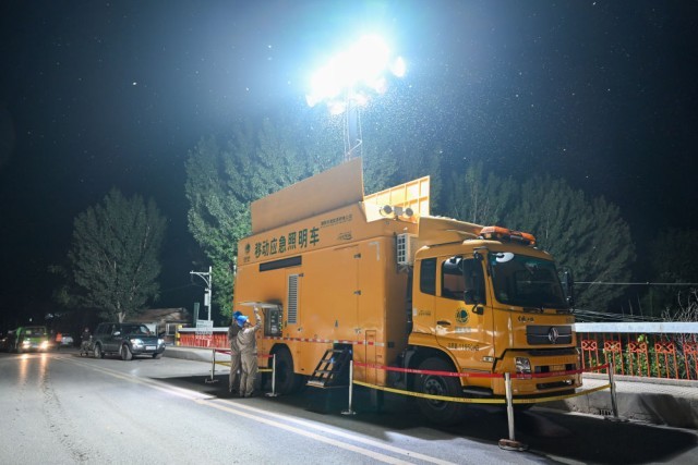 ↑8月4日,国网天津电力移动应急照明车在天津市静海区台头镇革命桥上为岸堤作业人员及巡堤人员提供移动应急照明保障。