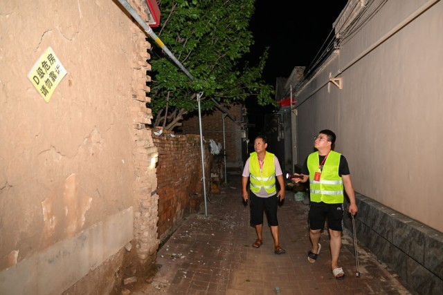 ↑8月4日,在天津市静海区台头镇南二堡村,村党支部书记、村委会主任韩建祥(右)带领干部检查村内危房。