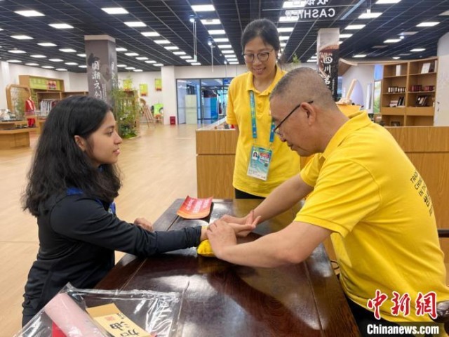 8月5日下午,巴拿马跆拳道运动员迪娅内拉体验中医。王利文摄