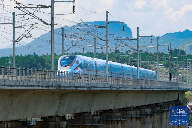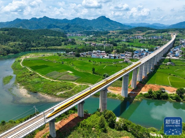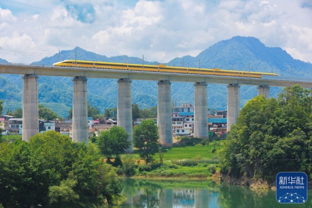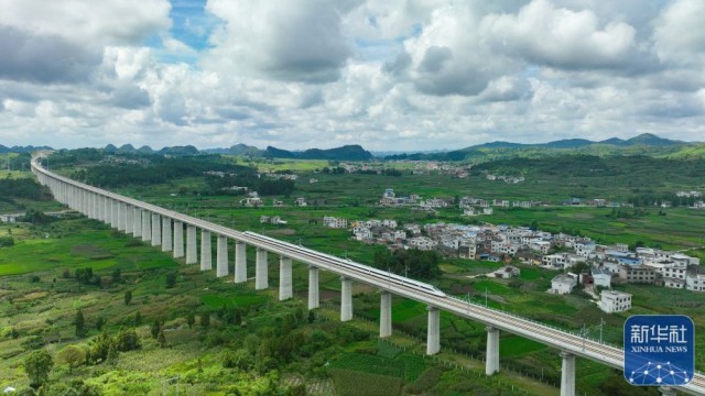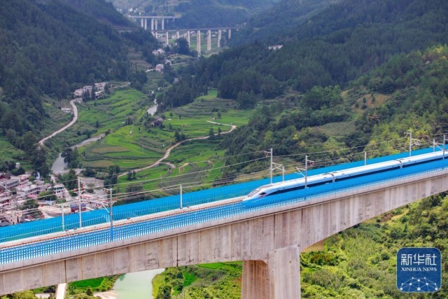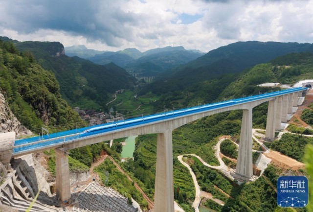 试验动车组经过位于贵州省都匀市的贵南高铁营盘清水河双线特大桥(无人机照片,8月4日摄)。