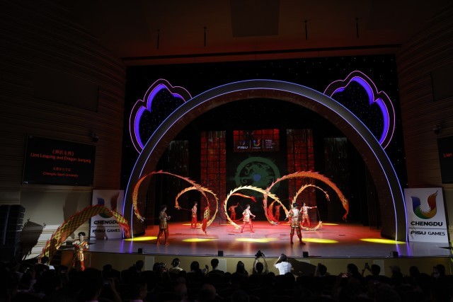 8月6日,来自成都体育学院的演员在表演《狮跃龙腾》。